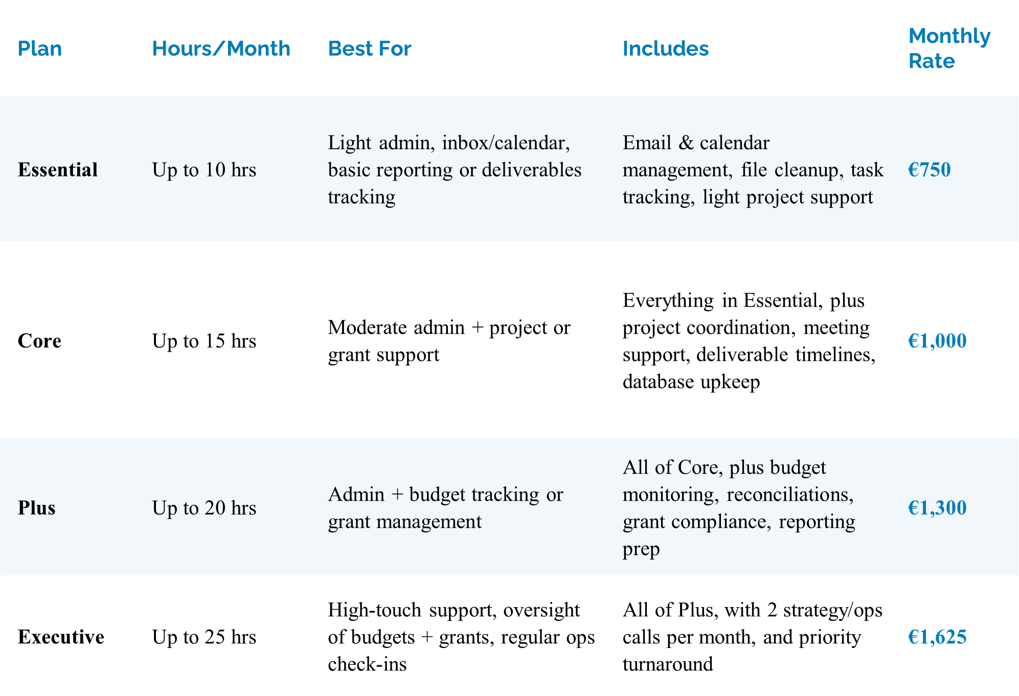 Not every organisation fits neatly into a predefined tier. If you’re managing cross-border projects, need flexible grant or budget support, or want a hybrid of services, we’re happy to build a monthly plan that works for your team.